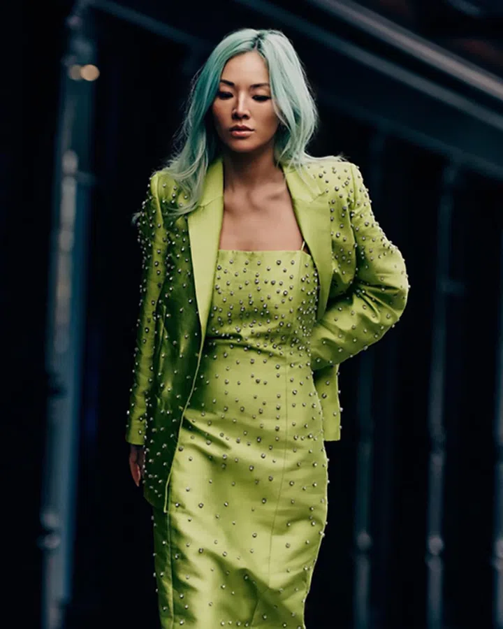 这身绿色套装来自Olivela #StandWithHer企划,该胶囊系列目前集合了众多设计师共同为女性赋权,即每个订单的20%收益都用于支持女性赋权运动的合作伙伴,为全球女孩及妇女创造机会。这套水晶缀饰西装及连衣裙来自丹麦Stine Goya。