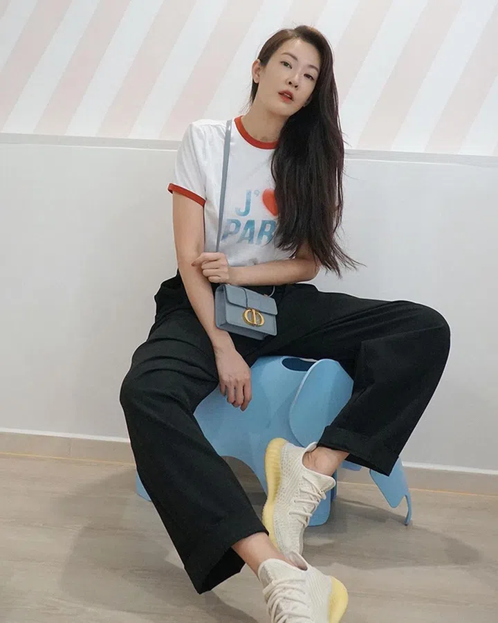 刘子绚也分享了同款超迷你包!有别于林慧玲的演绎,她选择以休闲的Dior T恤及Yeezy Boost 350球鞋搭配,穿出街头个性。
