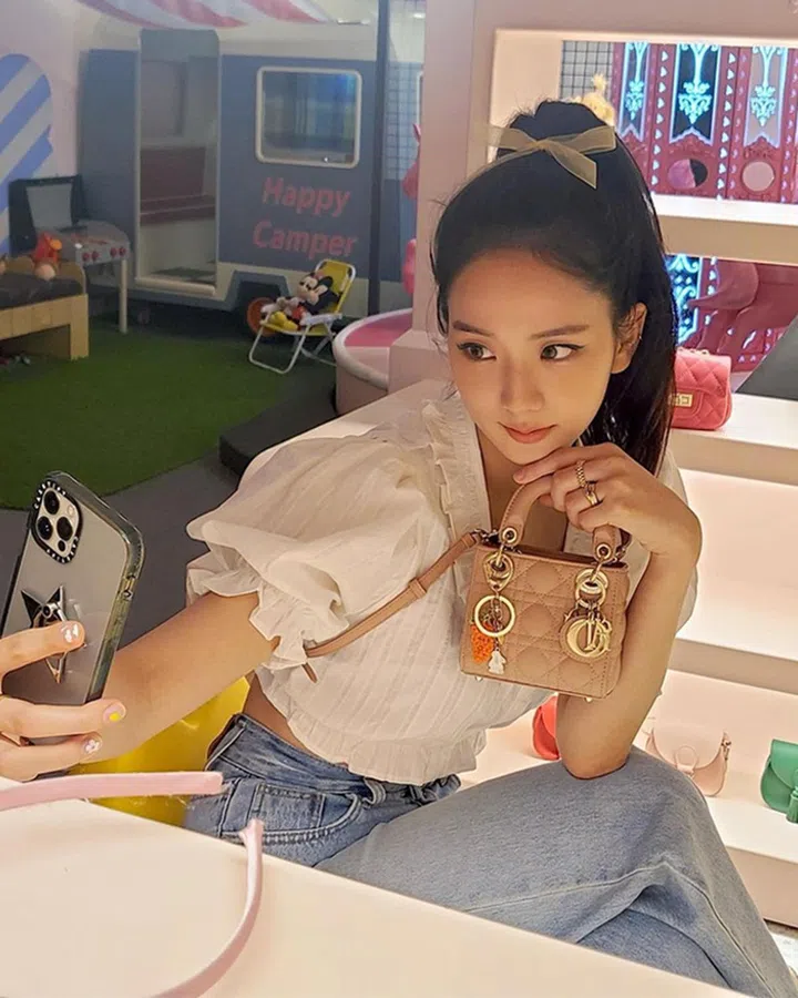 Jisoo在IG上传自己与超迷你Lady Dior包的自拍照,包包的尺寸比她的脸还小,为整体造型注入可爱的小女人气质。