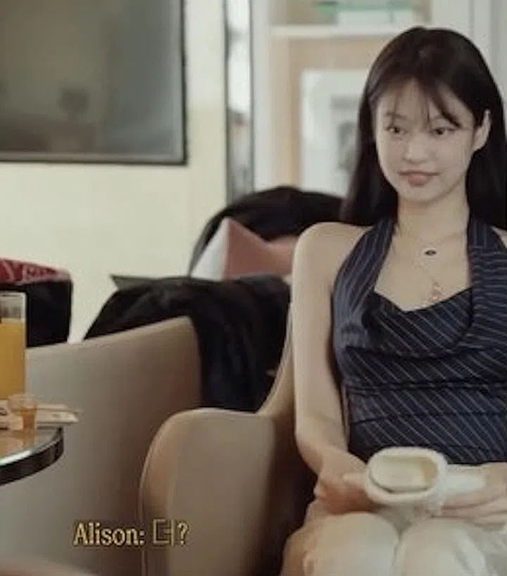 月前Jennie首登Dua Lipa主持的BBC节目At Your Service谈论演艺生涯,进行Podcast时也穿着了Not your rose的一款海军蓝立体剪裁挂脖上衣。