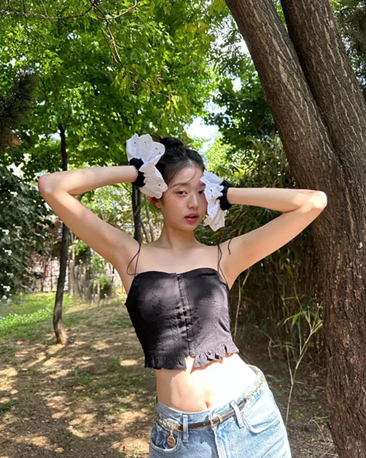 Not your rose该品牌的设计风格总体浪漫甜美,有着维多利亚时期的唯美元素,又带有性感、前卫的现代特色。IVE成员张元英自几年前就有穿过Not your rose的开衫、上衣及皮衣,今年这件黑色吊带蕾丝胸衣,造型更显可爱及性感。