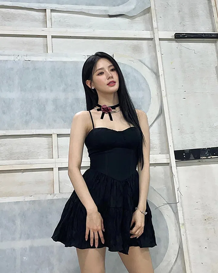 刚刚新晋Jimmy Choo全球品牌大使的(G)I-DLE成员赵美延,也多次在不同场合穿着Not your rose。上图这款少女感十足的吊带小黑裙,就是来自的Not your rose的Sasha dress。