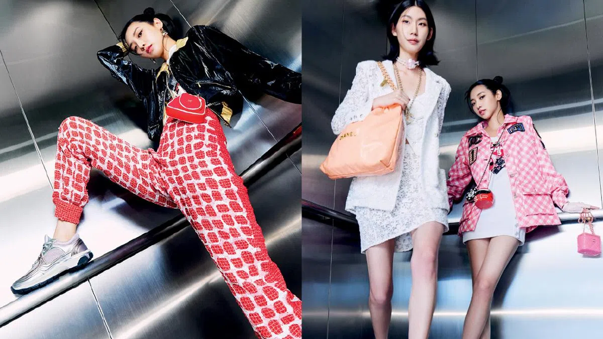 (From left) CHANEL 刺绣丝绸上衣、平纹针织短裙、树脂与水钻金属手镯、羊毛链袋、镶水钻丝缎高跟鞋;涂层帆布外套、亮片缀饰软呢长裤、树脂与皮革金属耳坠、Chanel 22大型皮革背包、帆布及皮革链袋、球鞋