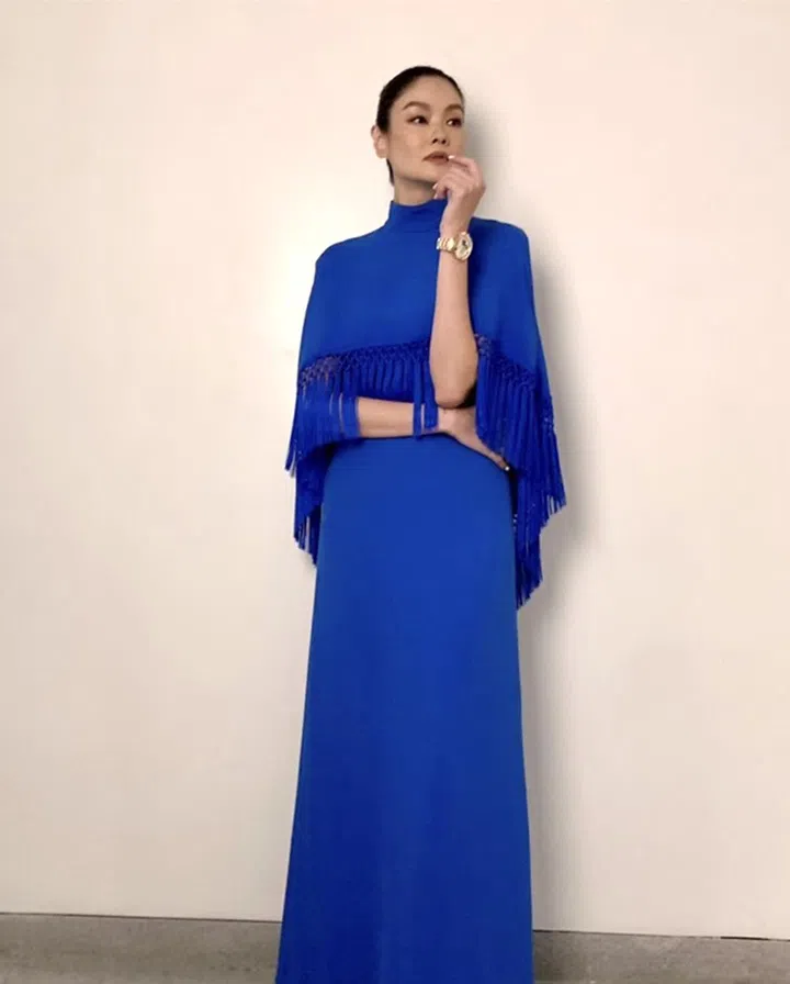 Sheila穿着Andrew Gn蓝色斗篷礼服,搭配Jimmy Choo高跟鞋及Madly珠宝,并佩戴了Zenith腕表。走起路来服装随步态摆动,摇曳生姿。
