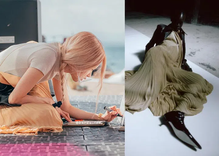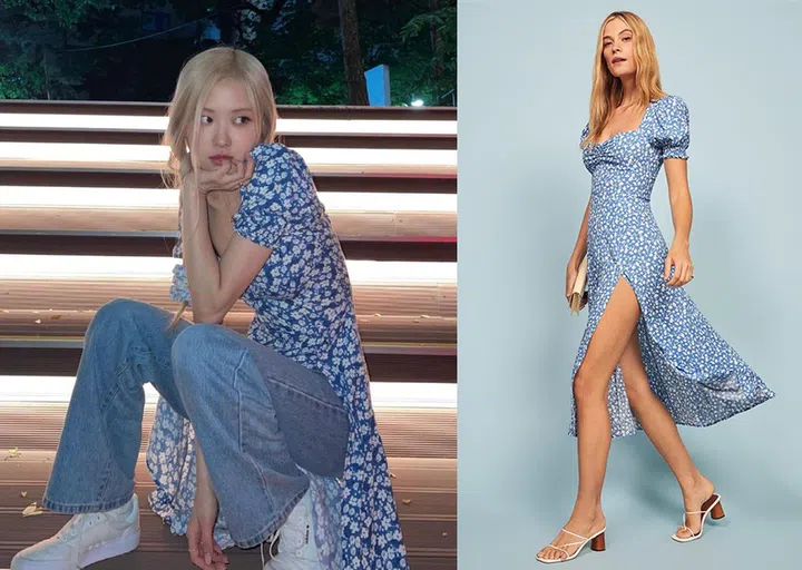 韩国女团Blackpink成员Rosé鲜少拍摄综艺,在《期盼已久的大海》首集,她以一袭Reformation碎花连衣裙(露出一截内搭的牛仔裤)登场和其他艺人一起彩排歌曲,穿出花系的少女感。