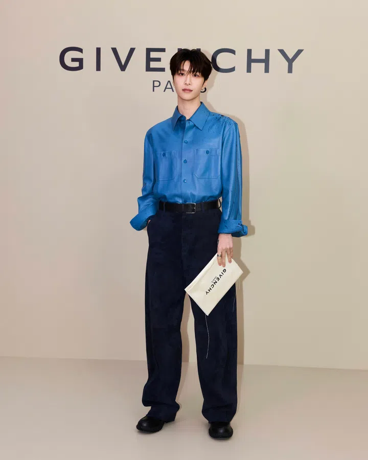 范丞丞以蓝色皮革衬衫搭配深蓝麂皮长裤亮相,造型简约利落,展现出兼具先锋气息与法式优雅的风格。此次大秀由创意总监Sarah Burton执掌,延续Givenchy标志性的力量线条与精致剪裁,范丞丞与章若楠同框出现,形成刚柔并济的视觉对比,成为全场焦点之一。
