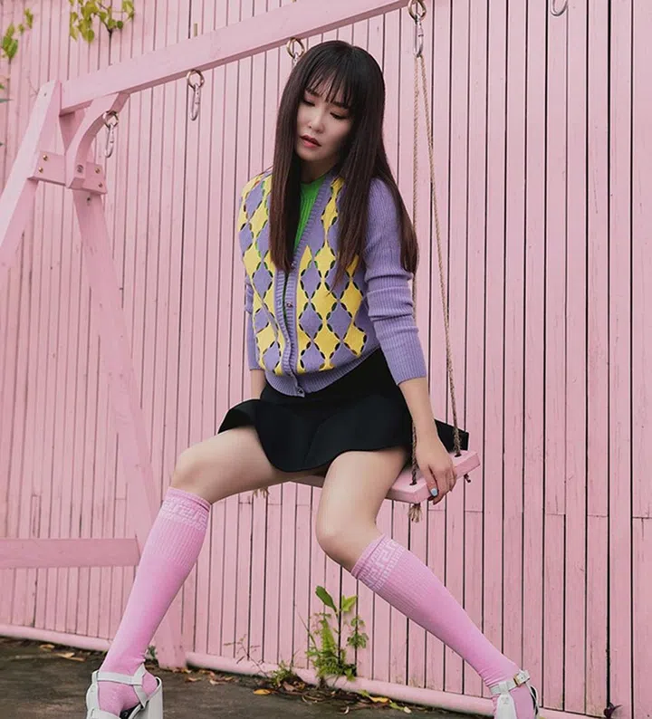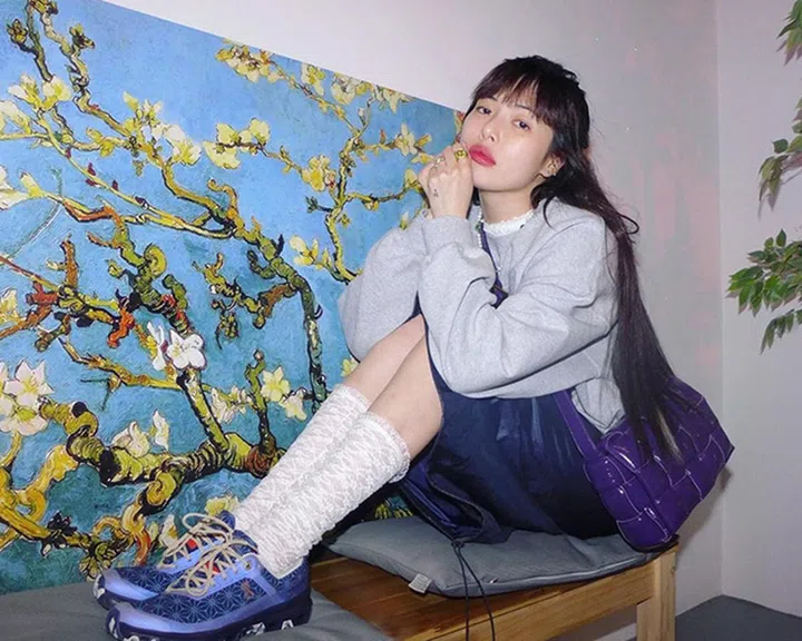 金泫雅的时尚风格向来诡异、大胆和突出。可遇到迷幻的Bottega Veneta紫色Cassette包 ,泫雅选择以蕾丝和灰色棉衣搭配,再以深蓝色短裙和球鞋中和,展露出犹如宇宙谜一般的气质。