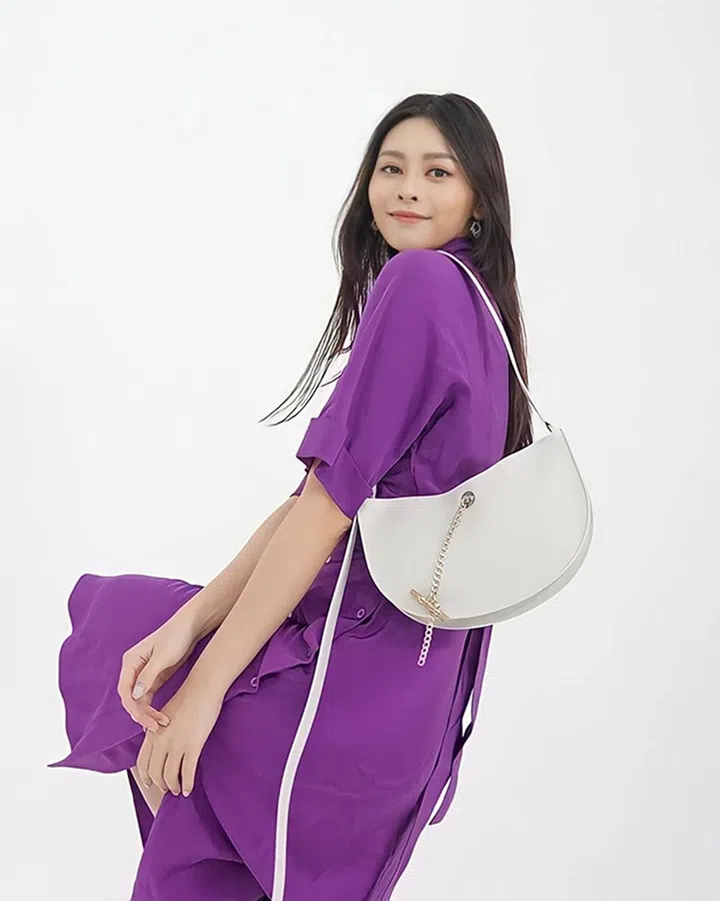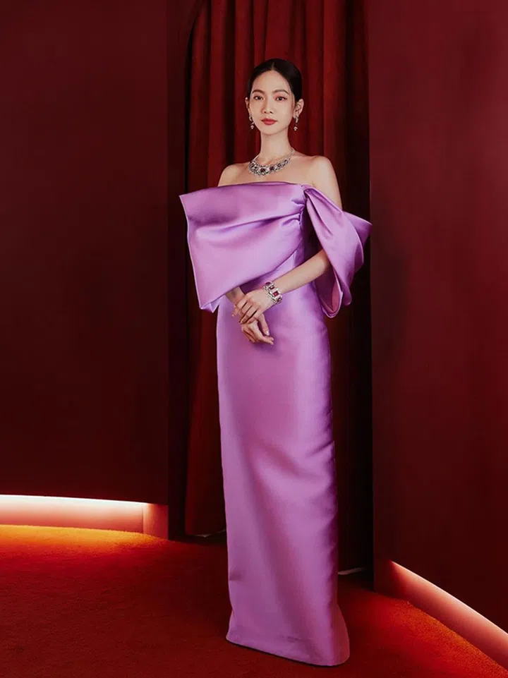 林慧玲的这身粉紫色洋装连身裙,领子与袖子上的聚拢面料细节洋溢着柔美的青春气息。拎上Tod's Timeless T挎肩包,更为造型增添层次感。