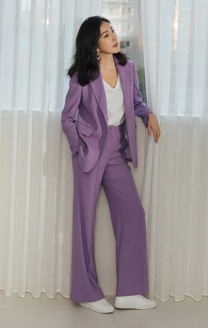 杨谨华私下穿搭多走随性路线。穿上宽版廓形的西装套装,内搭V领白上衣,展现不落俗套的性感。