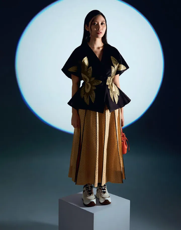廓形独特的单品,绝对让造型更精彩! 搭配线条分明的百褶裙,将自身曲线“雕塑”出来,整体造型唯美而时尚。