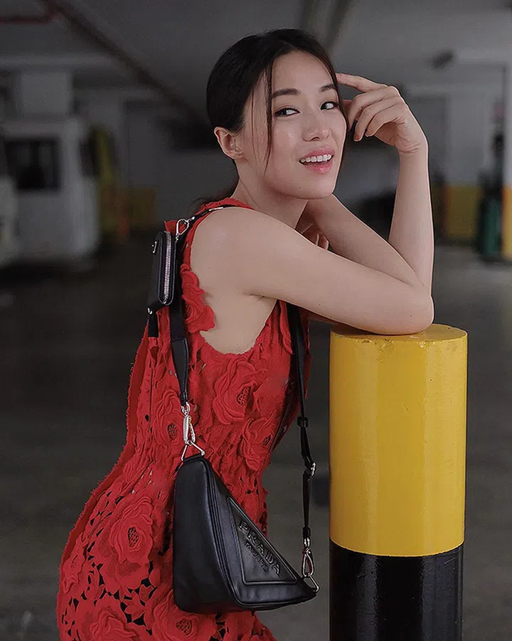 林慧玲以唯美红色镂空花卉连衣裙搭配高辨识度几何轮廓Prada Triangle肩袋,将品牌的三角形标记自然融合。同时还装饰带小包的宽肩带,日常生活中实用性极强,在office偶尔出门时还可单独拆下小包携带。