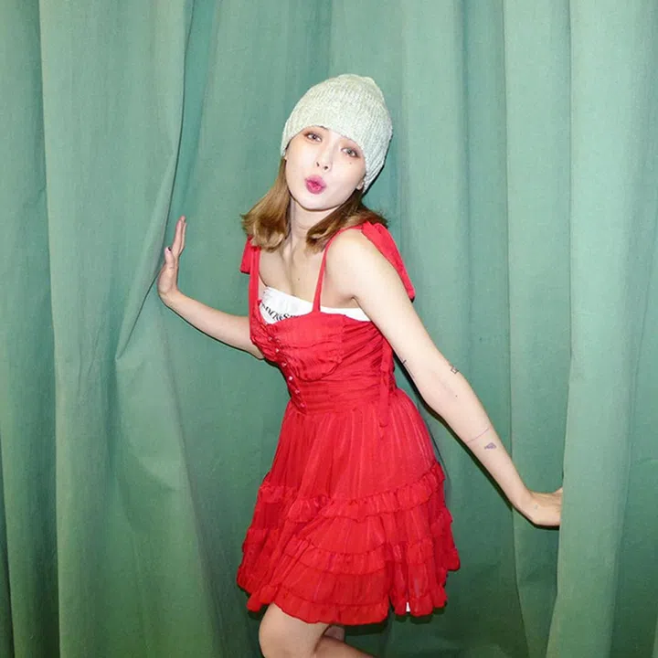 泫雅以独有前卫的时尚品味,为自己打出“韩流时尚女王”的地位,成为当代年轻人的时尚指标。这里泫雅以一袭青春少女风的红色连身裙,内搭白色T恤改造的文胸,再配上颓废风的浅灰色毛织绒帽, 穿出不羁但又充满品味的格郎基风尚。