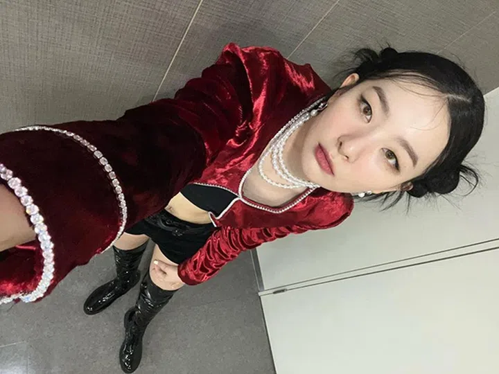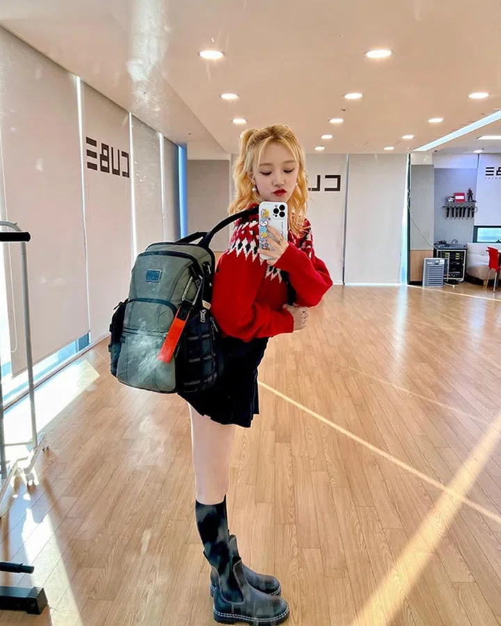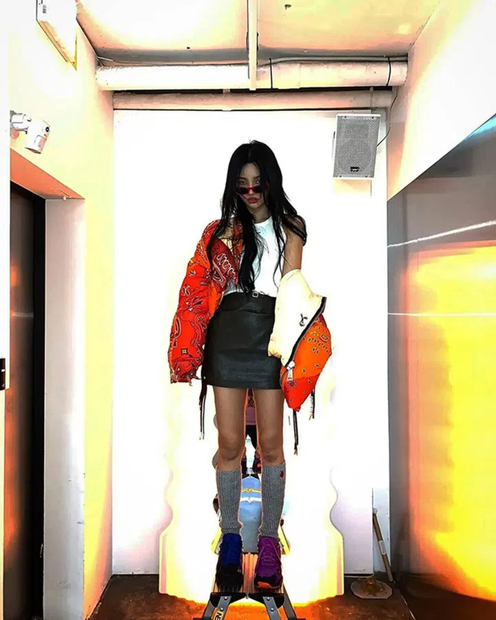 SOYEON这身穿搭散发了地下音乐club的叛逆与前卫,以红色的印花羽绒外套及左右不一的运动鞋展示高冷气质,炫出独有的自我个性。