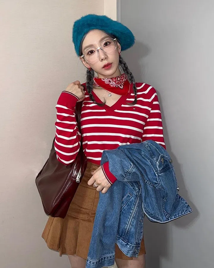 最近太妍在音乐圈越来越活跃,才刚公布加入女团特别企划GOT the beat,SM娱乐在 1月26日又宣布太妍的第三张专辑《INVU》将于2月14日推出。太妍近日的造型也非常多变,这身充满文艺气息的造型,以条纹V领上衣和棕色迷你百褶短裙为基础,再用印花丝巾、毛绒贝雷帽、牛仔外套、眼镜和深褐色包包进行搭配,层次感丰富。