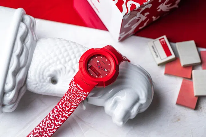 Casio邀请本地年轻插画艺术家Toby Tan合作,灵感汲取自新加坡标志性的鱼尾狮,以G-SHOCK AW-500为基础表款,设计了这款朝气十足的红白色手表。Toby解释设计理念,“打造今年的国庆日主题手表,我运用了红白色,对坚韧不拔的小岛祖国表达心中的感激之情。”