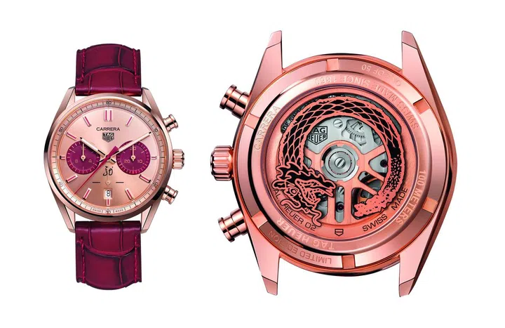 TAG Heuer为庆祝龙年推出两款限量版腕表,展现瑞士工艺与中国文化遗产。两款腕表一款为精钢材质(限量300枚,$9,000),一款为玫瑰金镀金材质(限量50枚),两者皆搭配红色鳄鱼皮表带。6点位置的小秒盘上,带有书法字体的“龙”字,表背的透明底盖上则印有一条黑金相间的龙形图案。此外,该龙年限量版腕表还拥有品牌特制的红色表盒,高雅又喜庆。