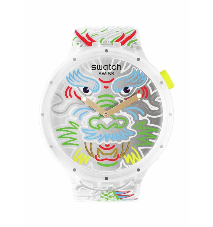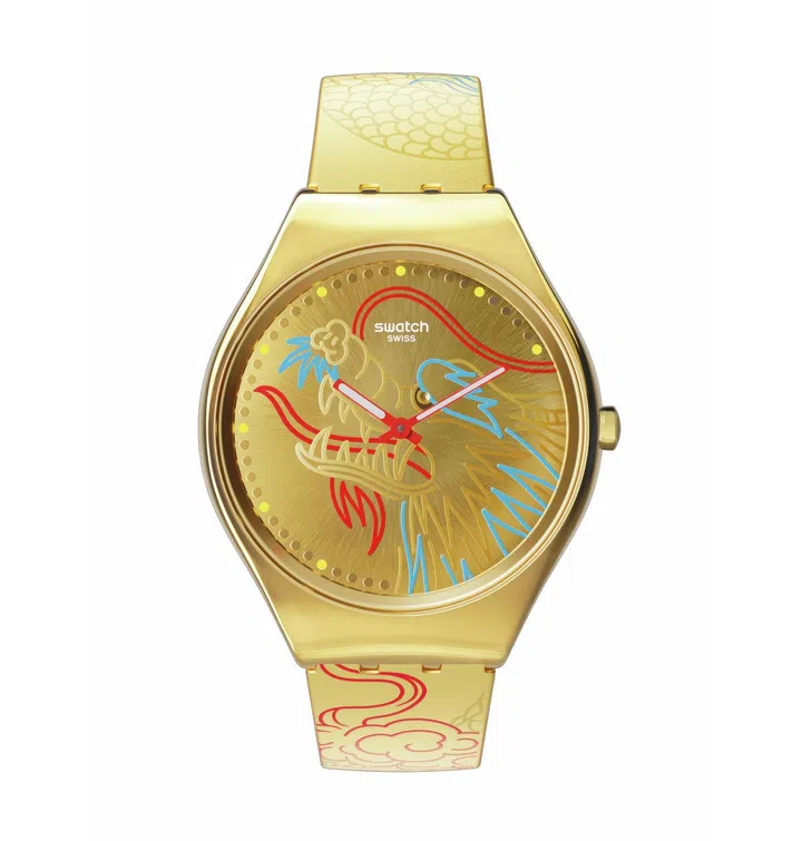 Swatch相信每个人内心深处都有一条华夏之龙, 这正是这个龙年系列背后的灵感所在。其中这款Skin Irony Dragon In Gold“龙门及第” 腕表,以代表中原核心的金色为基调,寓意领袖智慧和新年伊始。红绿色系代表着好运降临,也在整个腕表上形成更为精妙的龙纹图案,搭配画龙点晴的夜光指针,风格简约与又富有色彩张力。