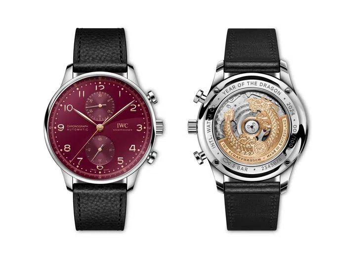 IWC推出Portugieser Chronograph计时腕表限量版,迎接中国农历新年。这款计时腕表采用41毫米精钢表壳,搭配勃艮第红色表盘(以“红火开年”为灵感)、醒目镀金指针与时标,兼具经典与优雅风范,限量发售1,000枚。透过蓝宝石玻璃表背,腾龙造型摆陀跃然而出,灵动耀目。同时, IWC也为该龙年特别版腕表配备黑色小牛皮表带与勃艮第红色橡胶表带两款表带,让你随心切换不同造型。