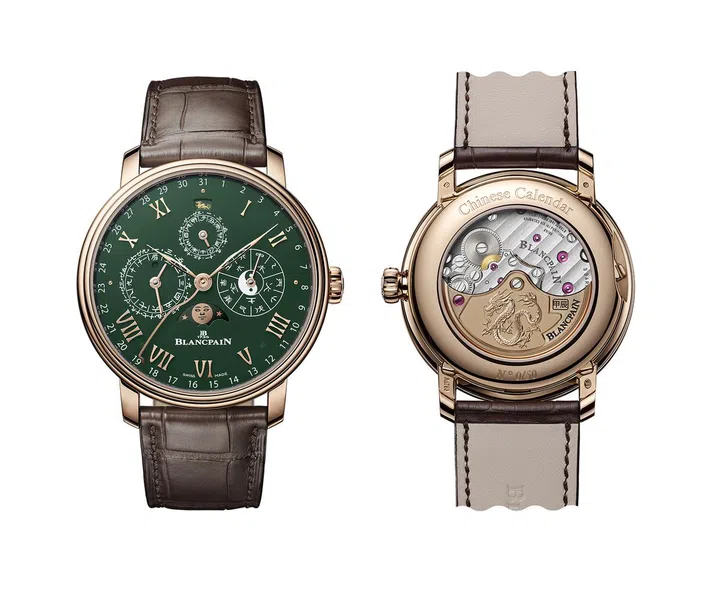 2012年Blancpain融合中华年历、公历日期与月相显示等多项复杂功能,打造出首款中西合璧的Villeret经典V系列中华年历表。2024年,正值这款大复杂功能腕表诞生第13年,品牌再焕新推出中华年历限量款“贵绿金龙”腕表,按照传统,红金上链摆陀镌刻一条昂首腾跃的祥龙,同时赋予全新形象与姿态,迎接中华年历表问世以来新一纪生肖轮次的盛大重启。该限量款腕表选用红金材质搭配绿色珐琅表盘(绿色是Blancpain美学中标志性且深受表迷喜爱的色彩),外观无比华贵,意指挡不住的新年鸿运。