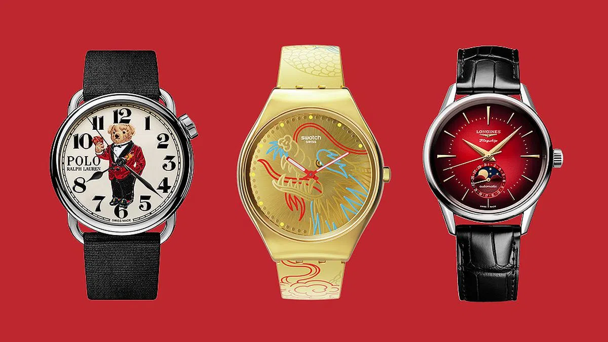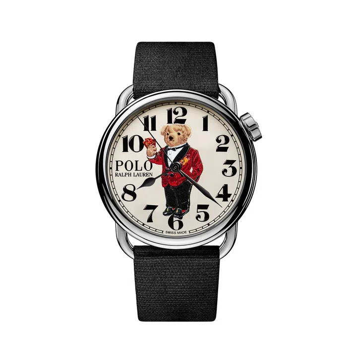 时尚品牌的龙年腕表?比如Ralph Lauren推出的Polo Bear腕表。这款腕表上的标志性Polo Bear穿着象征农历新年的吉祥服装:一件红色天鹅绒烟斗外套、缎质翻领配金龙绣花、缎质燕尾服裤、红色袜子和刺绣黑色天鹅绒拖鞋。右爪持三个金龙红色信封,寓意新年繁荣健康。