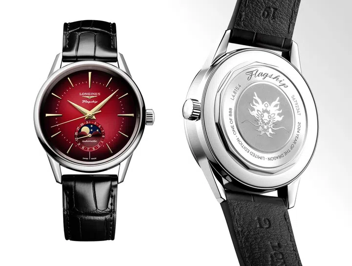 Longines首次推出的龙年特别版腕表,直径38.5mm,采用象征庆祝气氛的“龙吟红”渐变色表盘和复古金色指针,呈现出喜庆风格。融合月相显示的环形日历设计简约而精致。腕表背面特别展示了由艺术家林子楠结合星象学和甲骨文创作的龙头图案,全球限量888件,本地售于Wisma Atria 及Marina Bay Sands品牌专店。