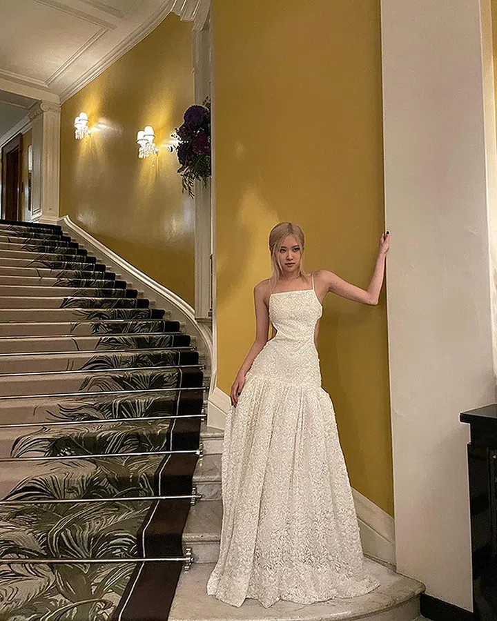 另一边则是近期作为Tiffany & Co.代言人出席品牌珠宝展的Rosé,她身上这款超梦幻的白色缀饰吊带连衣裙也是来自ROKH(2022春夏系列)。