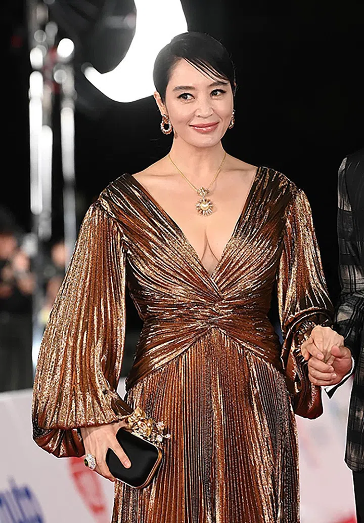 主持了青龙奖30年的影后金惠秀,早前就宣布今年将是她最后一次担任典礼主持人。青龙奖也也颁发了一座特别奖,感谢她这些年来的贡献。今年53岁的金惠秀,穿着Zuhair Murad金色礼服小露酥胸,状态还是keep得很好!