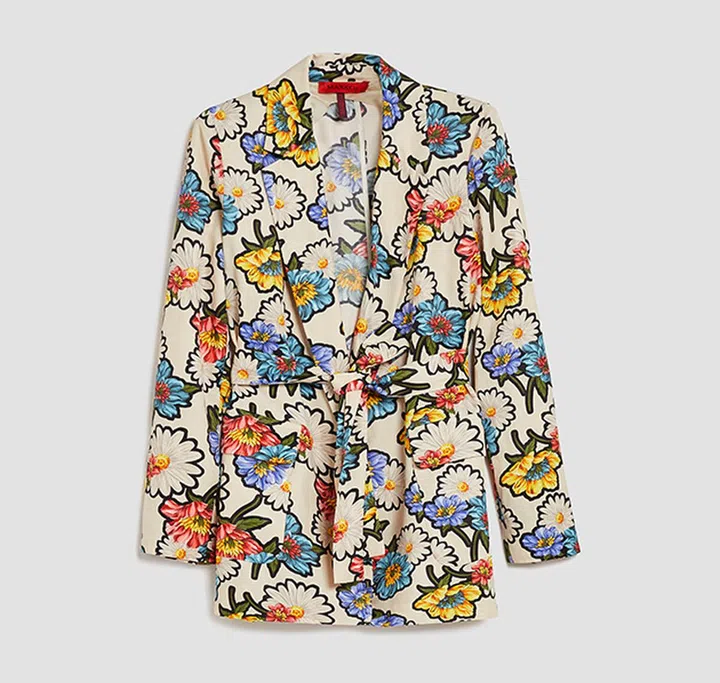 轻薄又亮眼的雏菊印花blazer,就别再想着内搭了。Margherita建议直接“真空”穿上,彻底感受一下自由和随性的快感。如果担心走光,也可以穿一件比基尼在里面,让造型显得轻松又阳光。