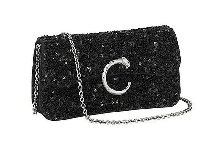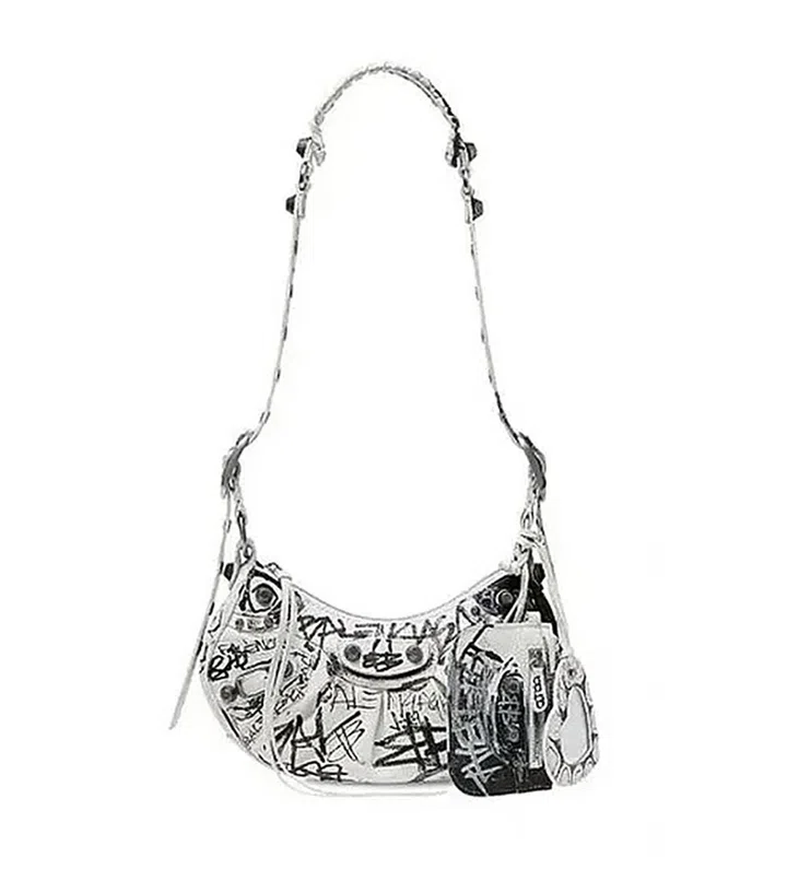 该系列手袋推出各式各样金属色皮革手袋款式,以及镶满锆石的璀璨设计。这款带黑色涂鸦的包款,造型充满街头态度,同时还配备可拆卸的拉链小包及化妆镜(就算没有带气垫/粉饼时也能方便地用小巧的遮瑕膏及膏状粉底补妆)