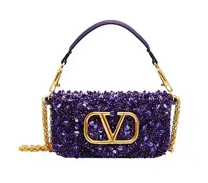 3D刺绣效果的华丽紫色调手提链袋,正面装饰超大金色VLogo,包盖采用磁性开合,金色链条可拆卸,方便你派对时斜挎或当晚宴包手拎。