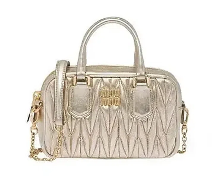 同样带可拆卸包链的Miu Miu手袋,低调的金属色璀璨但不落俗。风格灵活既能搭配梦幻连衣裙,也能搭配个性运动风造型。