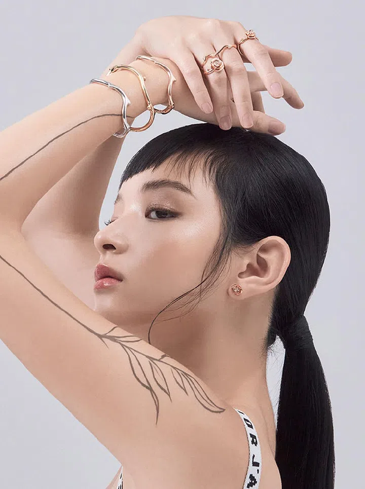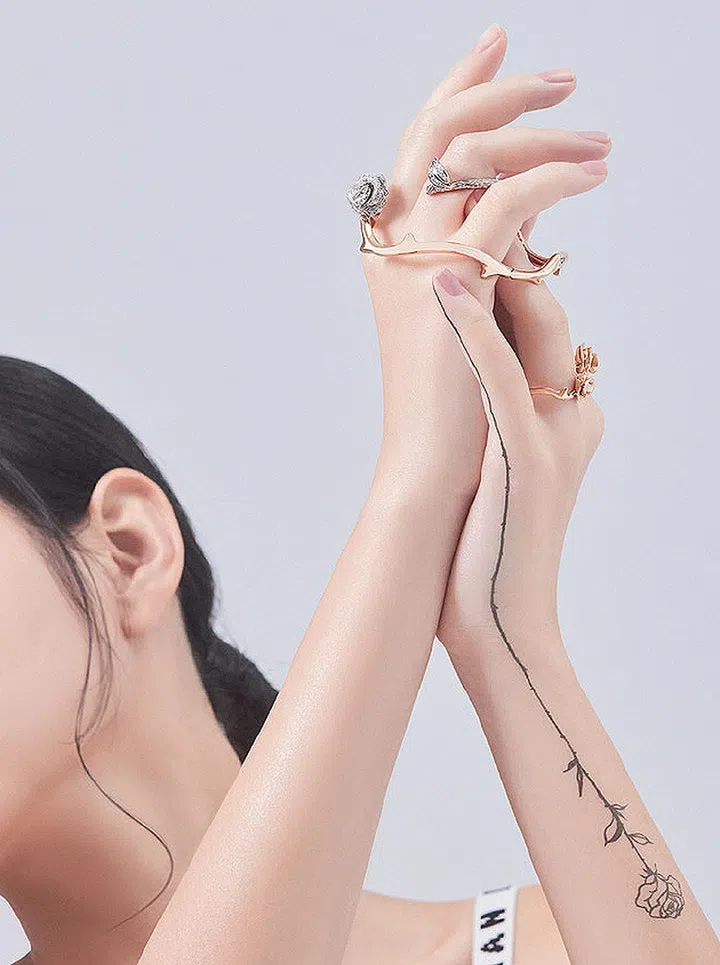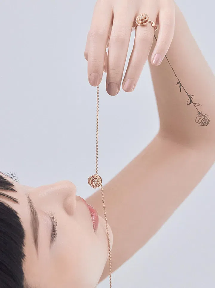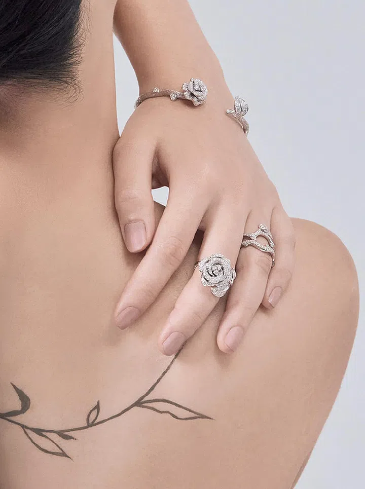 新作中融入更多现代元素:如Bois de Rose首次将花茎蔓延至手镯,还推出单边耳坠及双指戒等设计,其纤细戒指线条更适合叠戴。外加小巧精致的Rose Dior Couture首饰及造型华丽的Rose Dior Bagatelle,为女人创造了更多灵活造型的可能性。