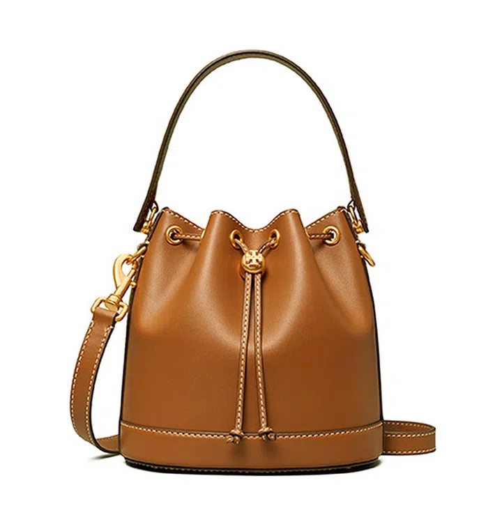 系列手袋及配饰包括海军蓝、黄色及绿色,也有简约的纯色皮革款式。比如这款咖啡色调的经典水桶袋,也是优雅又实用的上班包选择。