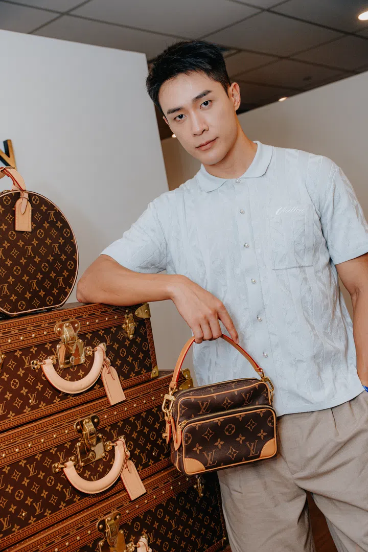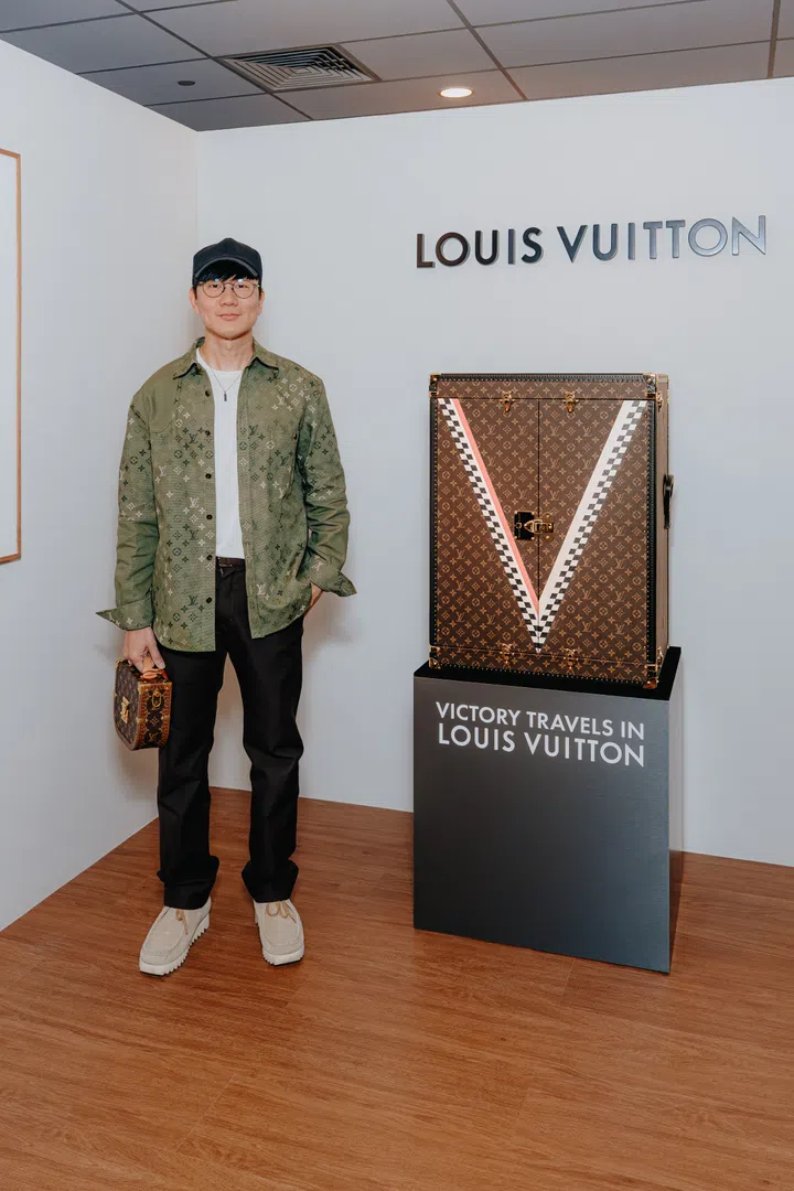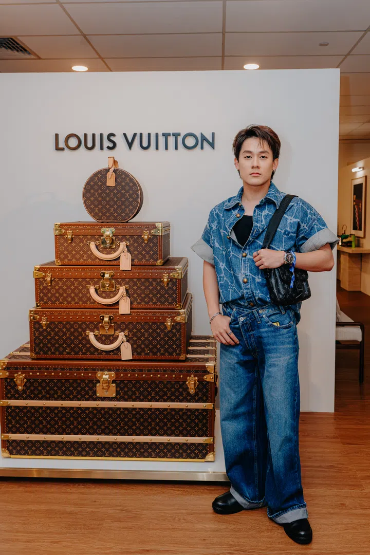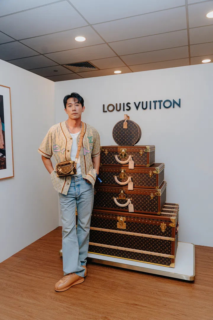 陈泂江以Louis Vuitton x Pharrell & Nigo 2025秋冬联名皮革棒球衬衫亮相F1新加坡大奖赛,搭配品牌Mini Soft Trunk斜挎包与浅色牛仔裤,展现轻松又带街头感的奢华姿态。他在赛道兴奋合影,尽显赛车迷的热情。