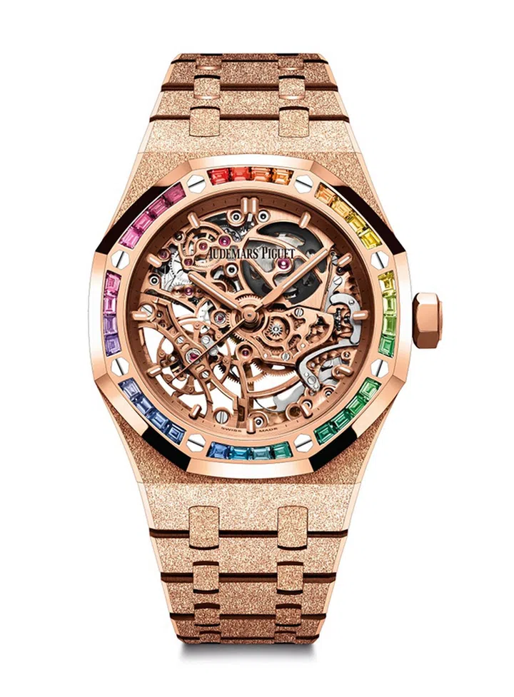 今年Audemars Piguet从高级珠宝腕表和高级定制时装领域撷取灵感,全新推出三款41mm和两款37mm的Royal Oak(皇家橡树)系列双金双摆轮镂空腕表,白金、黄金、玫瑰金的表款都闪耀霜金光芒。腕表以12种不同类型的宝石(如红宝石、沙弗莱石、祖母绿、黄玉、坦桑石、紫水晶等)打造的彩虹色表圈包围着品牌自主制作的Calibre 3132镂空机芯,将其双摆轮机制展露无疑。