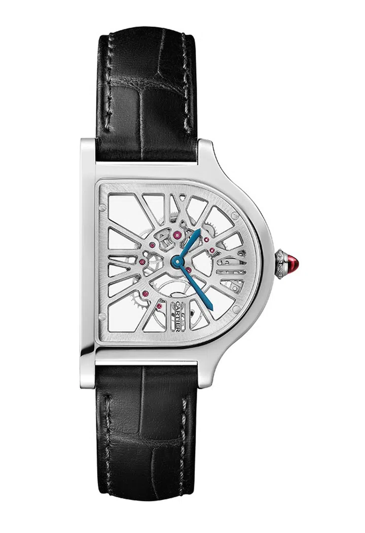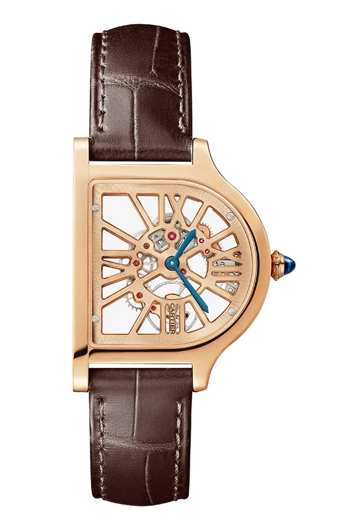 Cartier今年推出的镂空腕表,比如有镶钻猎豹镂空造型的Pasha de Cartier Skeleton腕表,以及这款造型别致的Cloche de Cartier腕表。这款腕表正面看造型好像“D”字母,但其实逆时针旋转90度,它的轮廓是一个座钟的形状,而且还让人联想到到柜台上的服务铃。