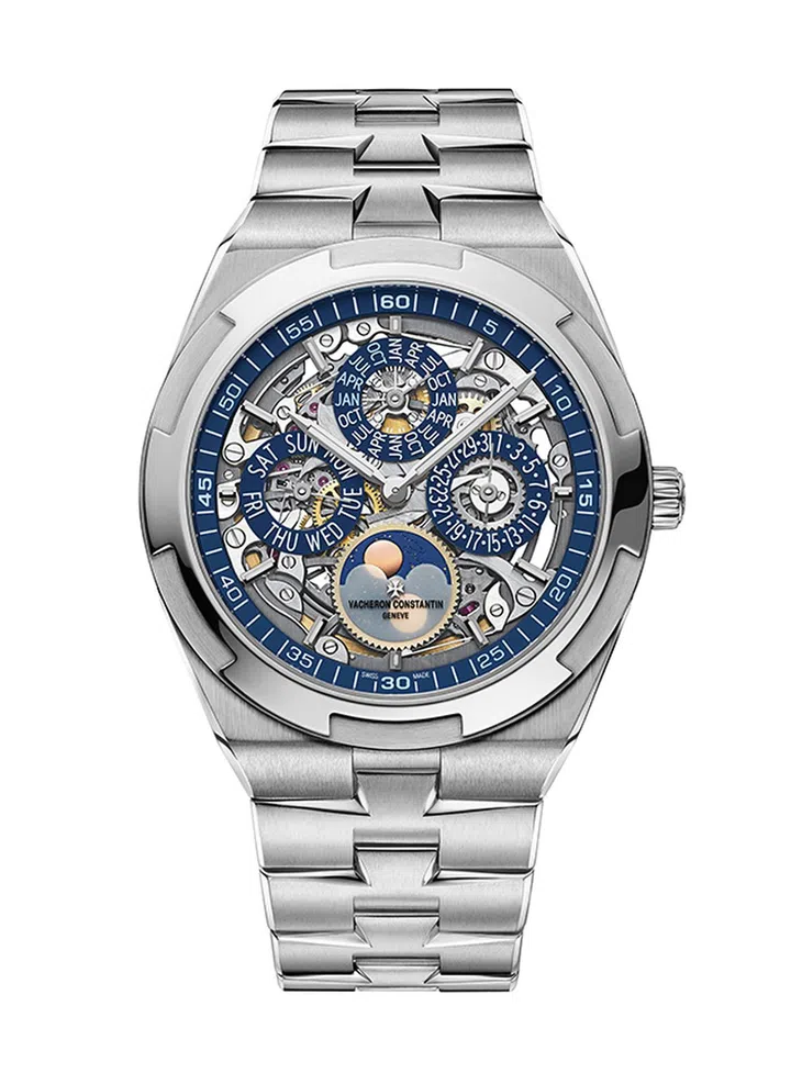 VACHERON CONSTANTIN Overseas Perpetual Calendars搭载品牌自制自动上链机械机芯、41.5mm 18K白金表壳、18K白金表链镂空腕表 (价格未定)