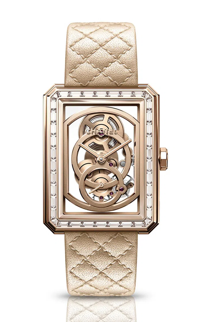 这款与前一款,都是品牌今年在Watches And Wonders 2021上呈献的新表型。从里到外的米金配色,外加baguette切割的璀璨钻石,还有绗缝设计的小牛皮表带,将品牌的优雅美学展露地淋漓尽致。