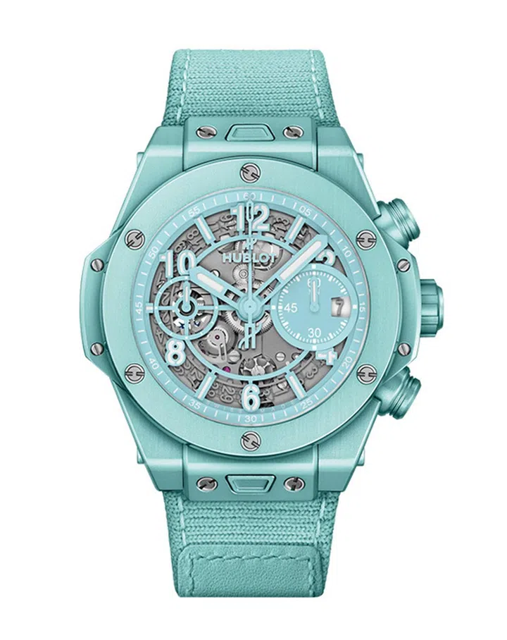 Hublot为Big Bang系列推出Unico夏季腕表,表壳采用如湖水般的绿松石色缎面抛光阳极氧化铝打造,并应用用色系搭配,连表带的缝线也是绿松石色调。而其机芯经过优化,不仅技术上得到提升,体形还更加纤薄。对于喜欢大表的女人,这款腕表就超适合你打造可盐可甜的时尚造型。