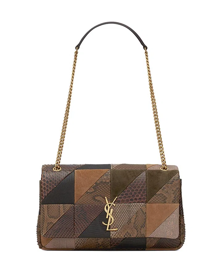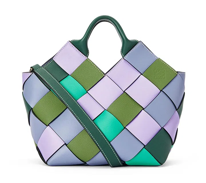 这款肩袋采用经典小牛皮编织而成,以紫、绿等颜色营造出交错的棋盘格纹。值得一提的是,这款包以再利用皮革制成,秉持品牌提倡的可持续时尚诉求。