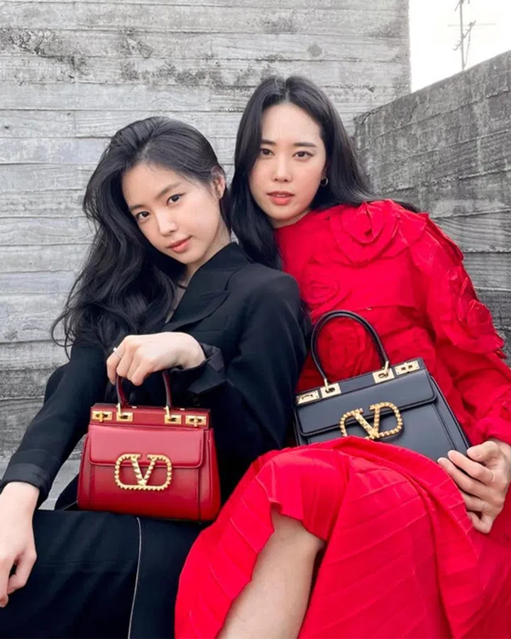 来个姐妹同款也ok!韩星孙娜恩就与妹妹一起进行拍摄,以交错的一“黑”一“红”服装+Alcove包玩出趣味视觉感。