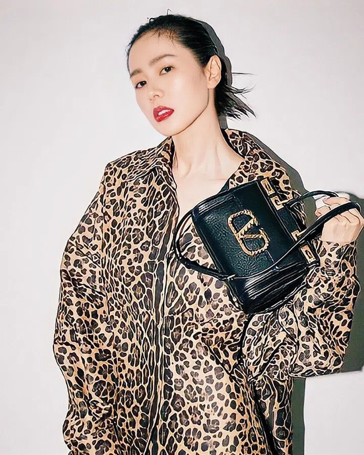 久未公开露面的孙艺珍,身穿Valentino宽松的豹纹衬衫搭配新推的Alcove铆钉帽,大展狂野奔放的时尚态度!