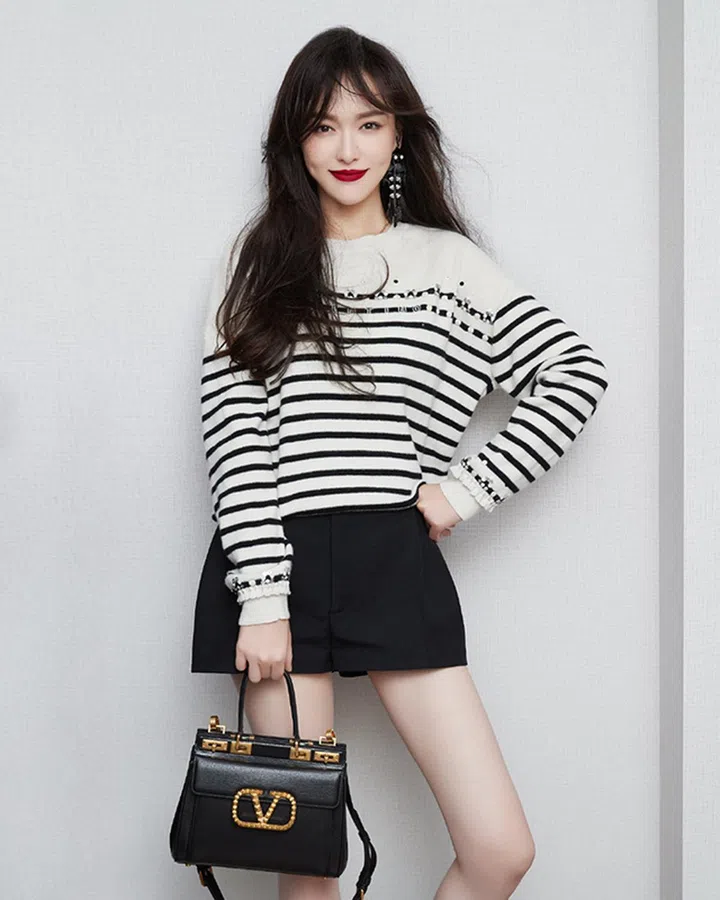 唐嫣也迷上Alcove包!继早前出席活动拎了迷你款,这次就以休闲的条纹套衫及短裙搭配小型的Alcove,看似慵懒却很有efforless的时尚态度。