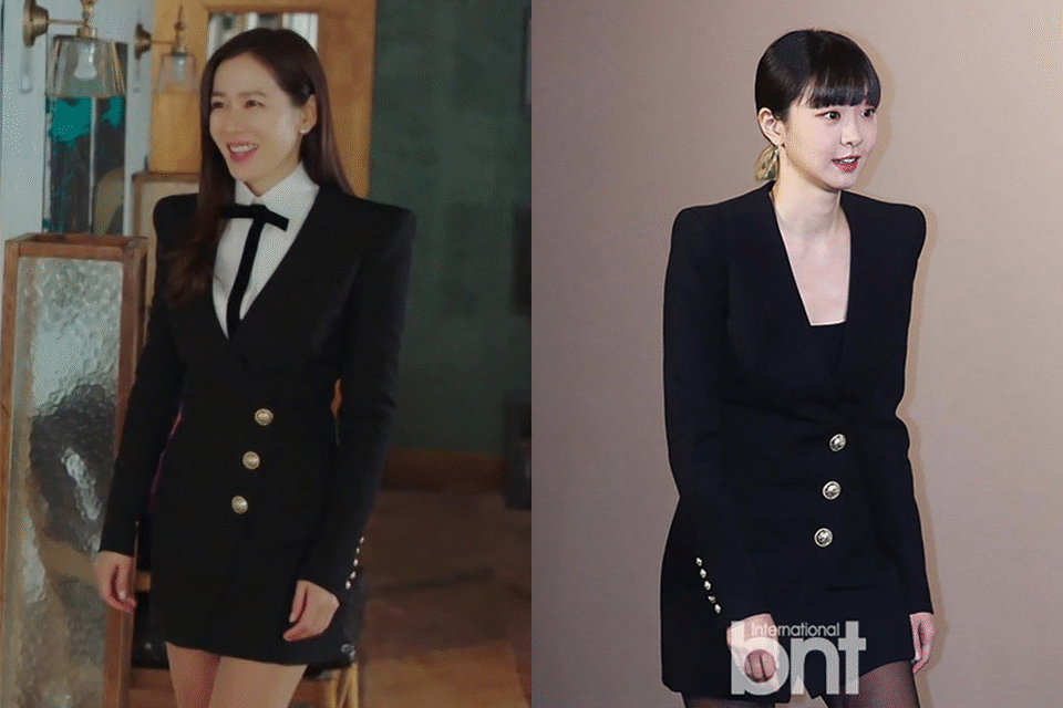 金多美与孙艺珍戏里戏外都“撞衫”!孙艺珍在《爱的迫降》一回归南韩,以一袭Balmain垫肩黑连衣裙,搭配白衬衫及细蝴蝶结出席新店开幕礼;金多美则单穿Balmain连衣裙搭配黑丝袜现身活动。