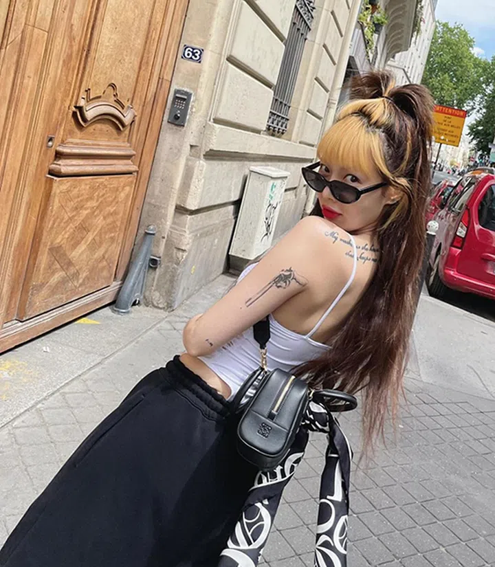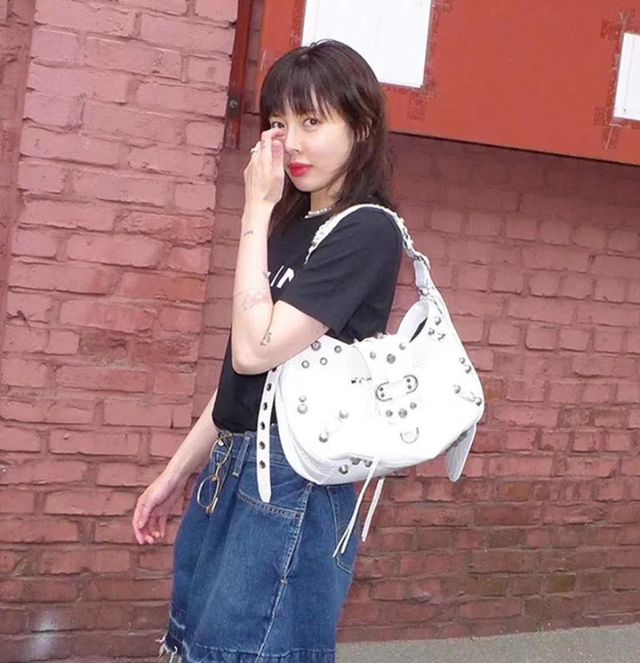 炫雅的狂野时尚taste,与品牌Balenciaga的独立时尚态度是划上等号的。 炫雅以衣柜必备黑色T恤搭配牛仔短裤以及罗马凉鞋,对比着Le Cagole的叛逆、庞克设计,营造出不屑的时尚随性态度。