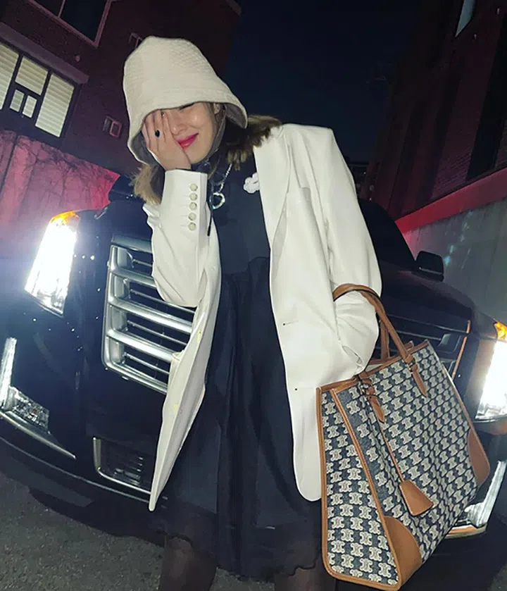 大型“购物袋”款式的Celine Cabas Triomphe,炫雅亦能驾驭自如。一件LBD(小黑连衣裙),再罩上一件休闲款式西装外套,让手里的Cabas Triomphe手袋显得格外醒目,气质满分!