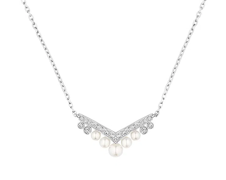 Chaumet的Joséphine Aigrette白金项链恰到好处地融合了璀璨钻石和Akoya珍珠的光彩。这件珠宝向品牌的珍珠传统致敬,同时通过其标志性的V形设计,展现独特风格。Joséphine系列的每一件作品都是对冠饰艺术的现代诠释,让你自由演绎风格变换,并以自己的方式展现自信光芒。