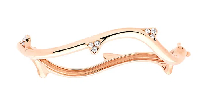 Bois de Rose系列灵感源自Christian Dior最爱的花朵——玫瑰,并以抽象设计诠释玫瑰花茎及花刺,造型别致又浪漫。这款手镯采用巧妙的开合机关,让手镯可以向两侧打开穿戴,方便穿戴又有设计美感。