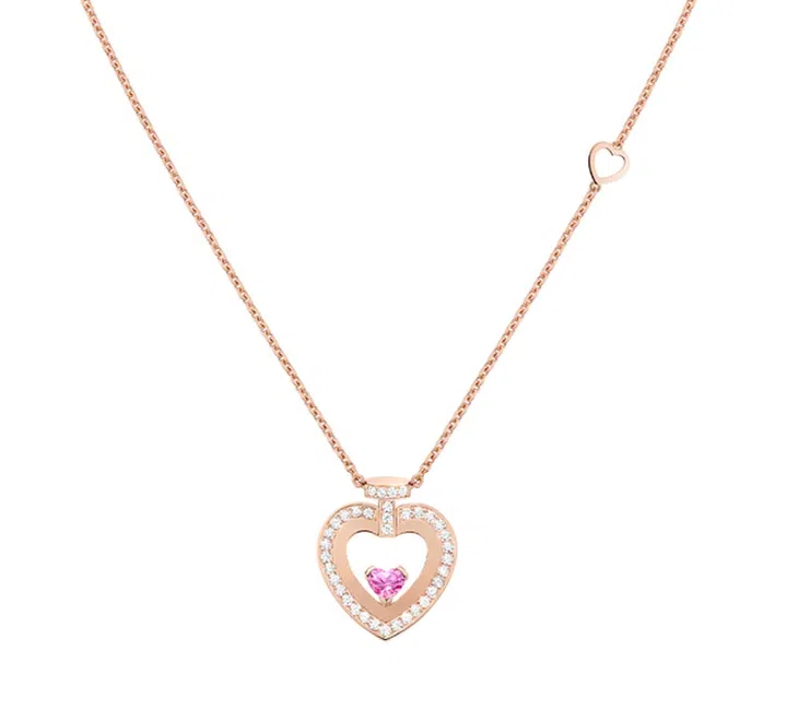 Pretty Woman系列的新款“Pretty Woman In My Heart”项链,设计轻盈俏皮。吊坠以玫瑰金和钻石勾勒轮廓,中心装饰0.3克拉心形粉红蓝宝石,仿佛一颗跳动的心,给经典造型带来新意和活力。另外,链上还带有一个不对称的小金心细节,为项链增添额外的精致感。