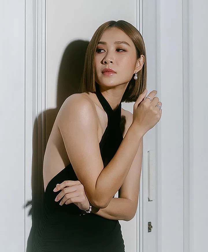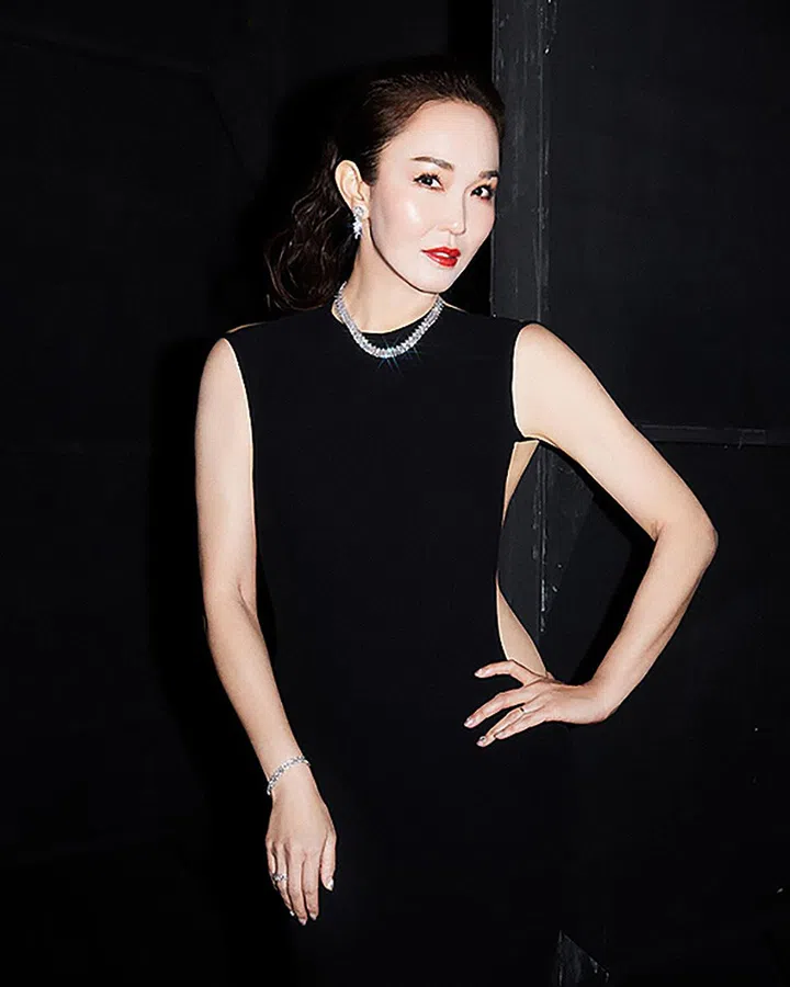 雅慧穿着Norma Kamali黑色礼服,胸前的交叉设计简约又性感,整体线条修长优雅,并搭配了Tiffany & Co.珠宝的钻饰及珍珠首饰。